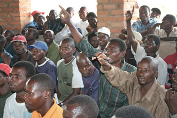 Congolese refugees in Mwange camp at a meeting with UNHCR officials and visiting members of their government.