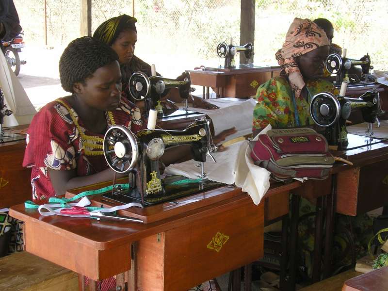 Women work with sewing machines in the vocational training centre in Beureh village, southern Chad.