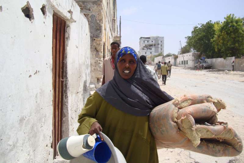 A Somali woman carries her belongings as she flees to safety in Mogadishu a few weeks ago.
