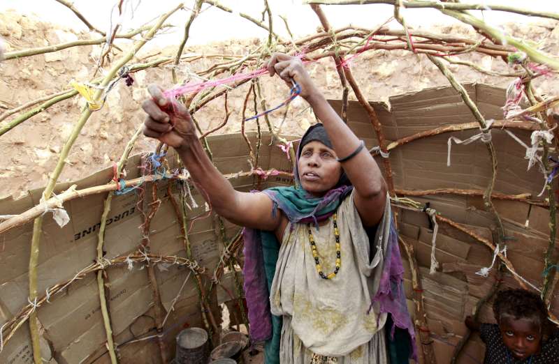 Grandmother Nuuriya constructs a new home from cardboard, branches and string in Galkayo.