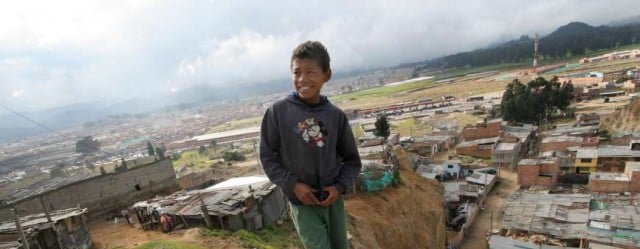 Barrio "Altos de la Florida", shantytown, Bogota. An IDP child stands where one of his friends recently fell down a 50 meters high rock barrier located just next to their houses.