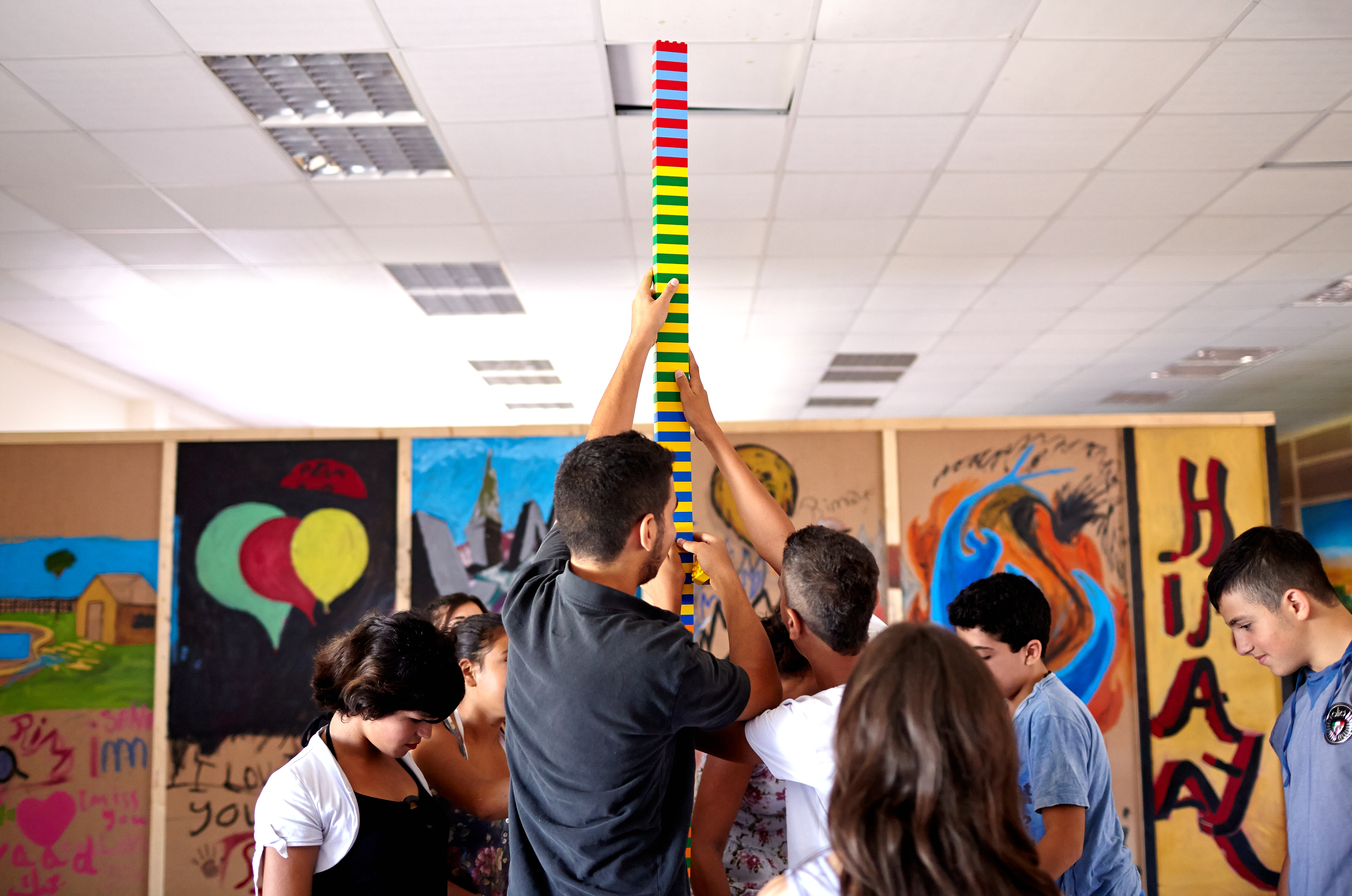 وشرح قائلاً: "نحن نحاول بناء برجٍ متين وثابت". بدا الأمر وكأنّه بمثابة متعة واضحة، ولكن كيم أشارت إلى أن التمرين يركّز على تشكيل الفرق وحلّ النزاعات مما يساعد هؤلاء الأولاد على بناء ثقتهم بأنفسهم وتعزيز تفاعلهم مع بعضهم البعض.