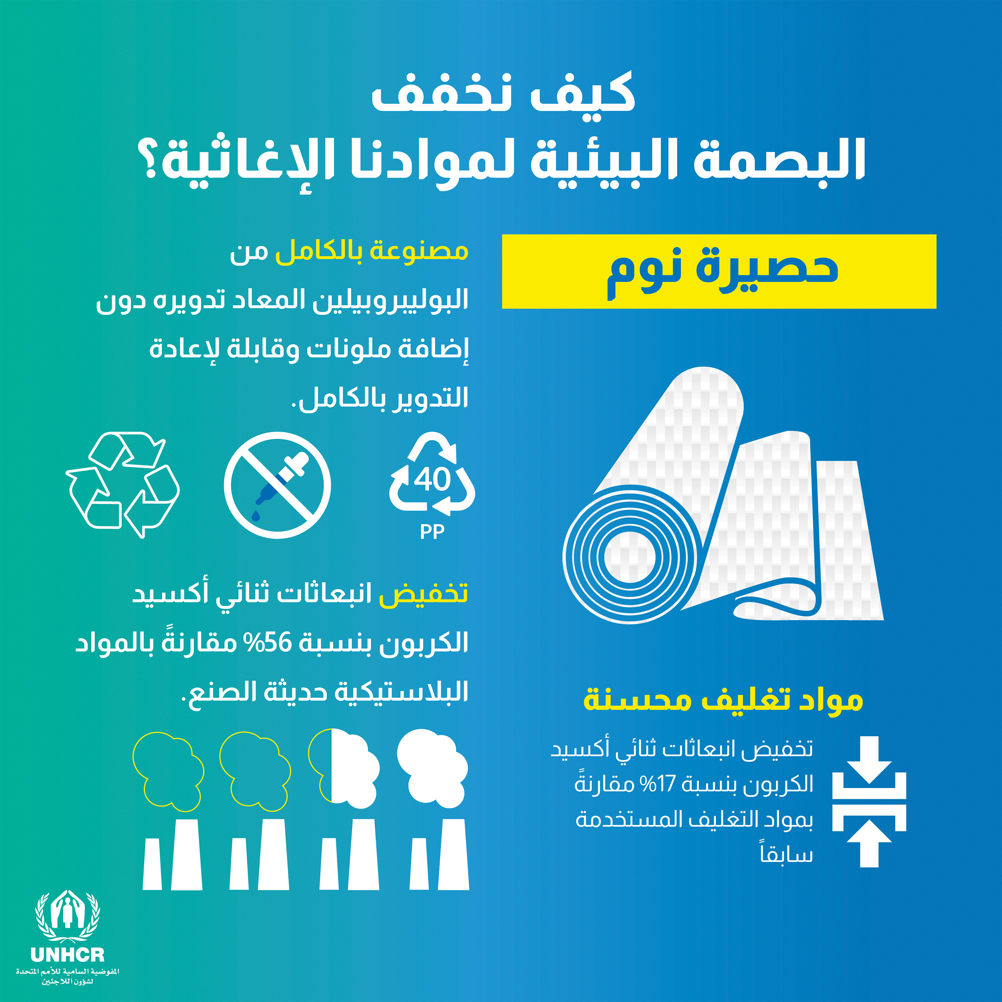 ونظراً لأن أزمة المناخ تجعل الحياة أكثر خطورة بالنسبة لأولئك المجبرين على الفرار، فإننا نعمل على تغيير الطريقة التي نقدم بها الحماية ونوصل من خلالها المساعدات. ويشمل ذلك الالتزام بخفض البصمة الكربونية الناتجة عن مواد المفوضية الإغاثية بنسبة 20 بالمائة بحلول عام 2025. ولتحقيق ذلك، فإننا نعمل على إيجاد طرق لجعل سلسلة التوريد بأكملها أكثر استدامة مع دعم الاقتصادات المحلية أيضاً، وإيجاد الفرص للاجئين والمجتمعات المضيفة لهم. إليكم الطريقة: