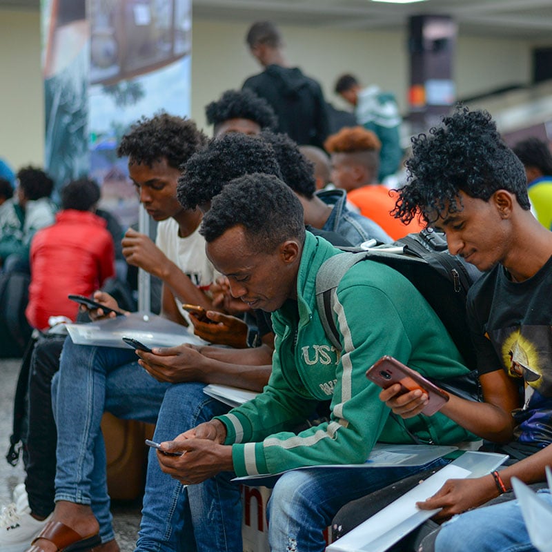 Young refugees evacuated from Libya check their phones using the free WiFi at Kigali International Airport in Kigali, Rwanda. ©UNHCR/Eugene Sibomana
