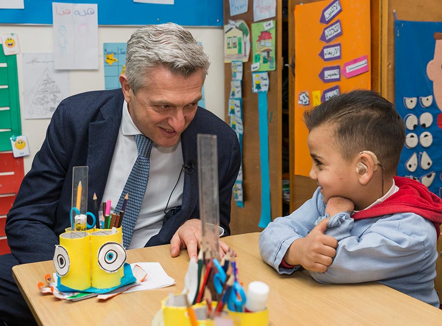 UN High Commissioner for Refugees Filippo Grandi meets 7-year-old Syrian refugee Mohammad during a visit to the Father Andeweg Institute for the Deaf (FAID) in Beirut, Lebanon. © UNHCR/Claire Thomas