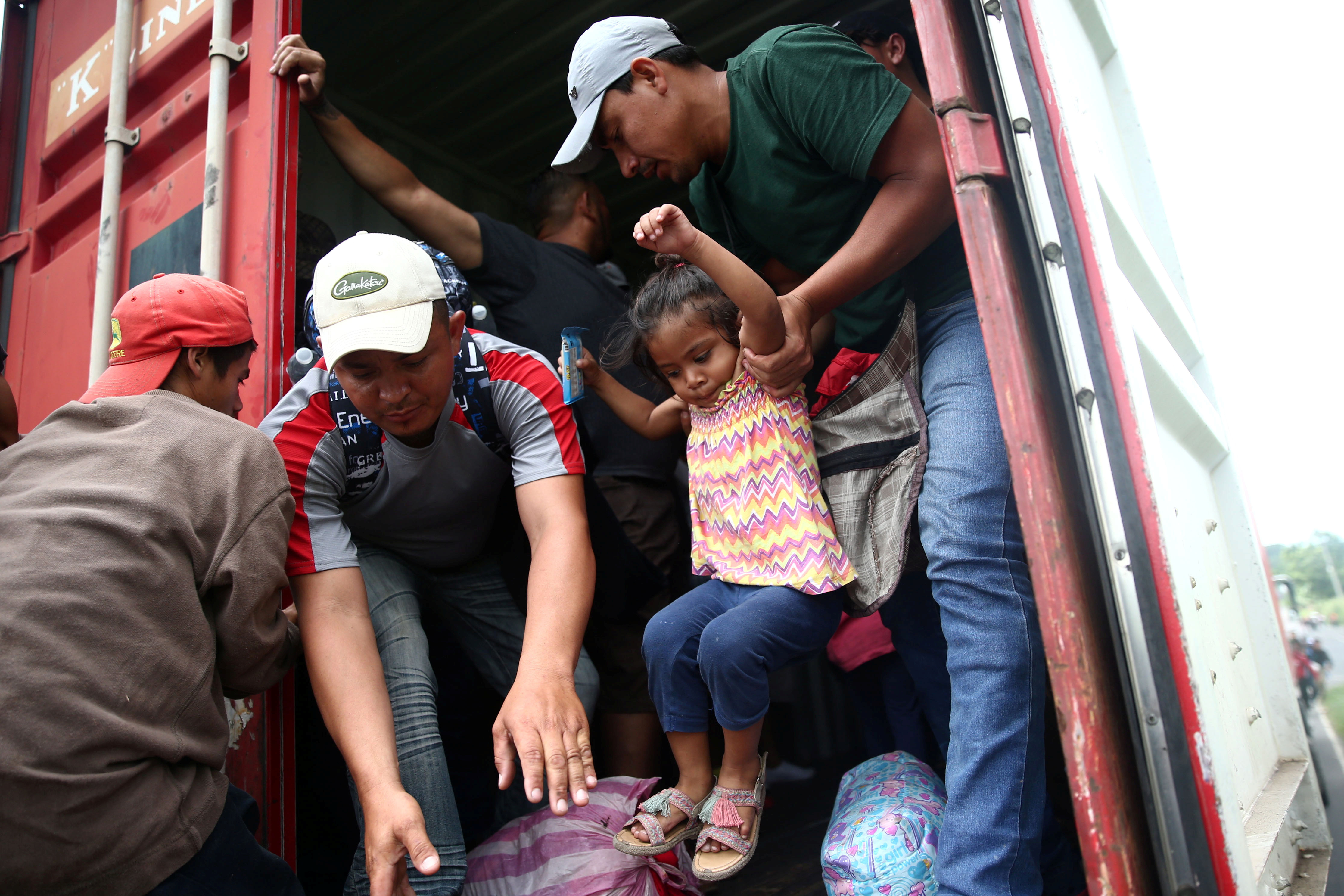 Hondurans travelling north as part of a so-called caravan climb onto a truck in Escuintla, Guatemala, on 18 October 2018.