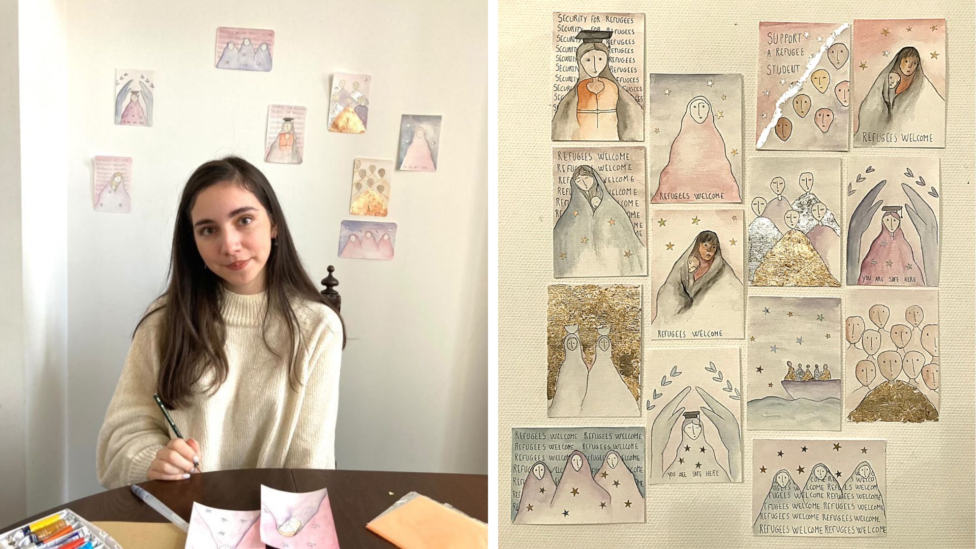Solenn pictured alongside cards she drew to raise funds for refugee education