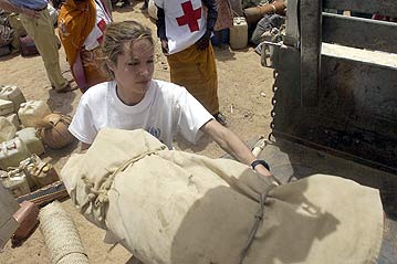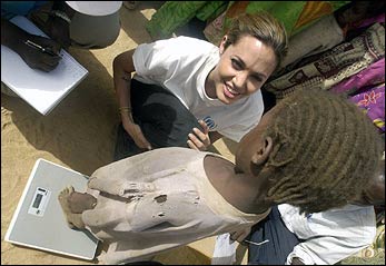 UNHCR Goodwill Ambassador Angelina Jolie helps refugees load their few belongings onto a truck near Tine, Chad, for transport to the safety of UNHCR camps away from the Chad-Sudan border region. These are the most recent refugees to make the treacherous journey across the scorching desert.