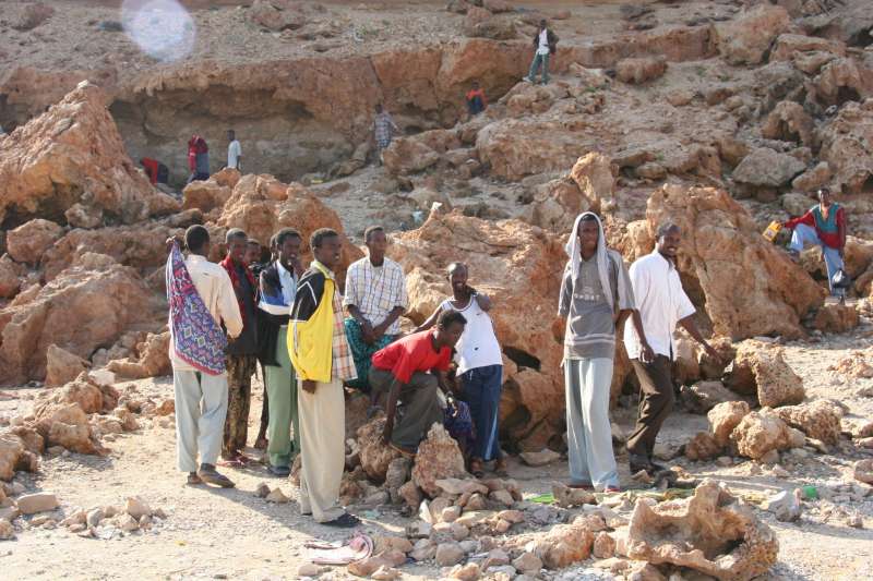 A group of men wait in a cove near Bossaso for a boat to take them across the Gulf of Aden to Yemen.