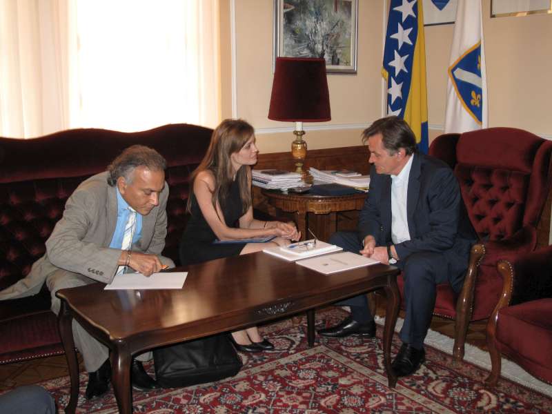 UNHCR Goodwill Ambassador Angelina Jolie, accompanied by UNHCR Representative in Bosnia and Herzegovina, Naveed Hussain, (left) discusses measures to assist the remaining displaced people in the country with the Chair of the Bosnia and Herzegovina Presidency, Haris Silajdžić.