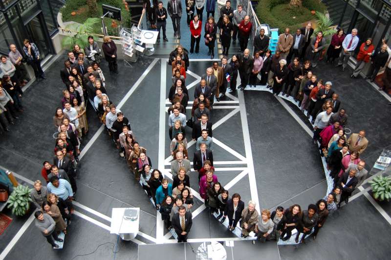 UNHCR staff gather in the atrium of the headquarters building to spell out "No" at the start of the 16 Days of Activism.