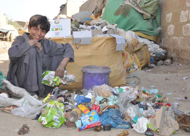 A young garbage collector squats beside a pile of rubbish at a small separating depot in Karachi.