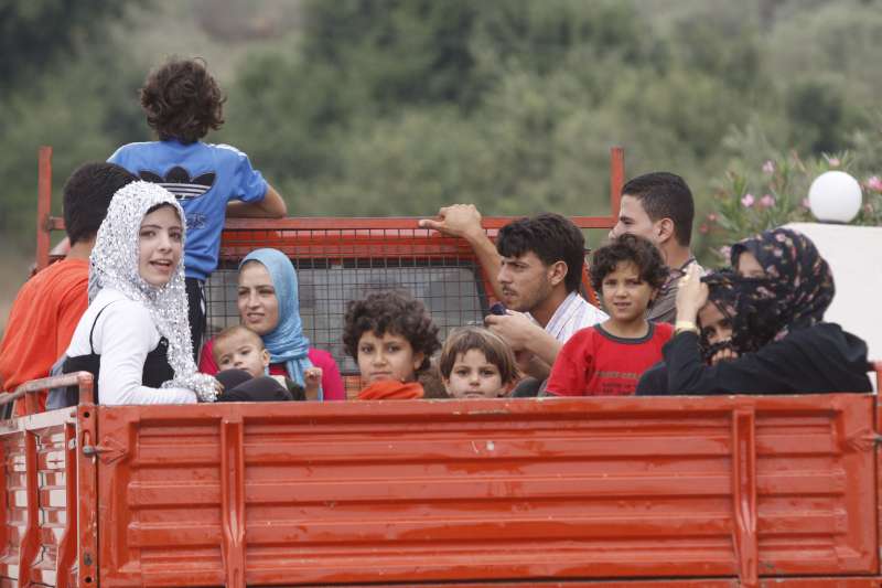 A Syrian family gets a lift at a crossing to Lebanon where they will register at UNHCR centres.