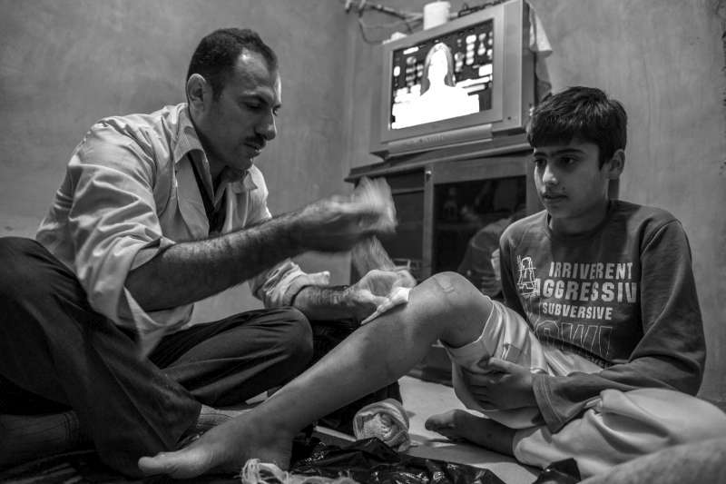 After completing his shift at the clinic in Domiz, Dr Hassan visits a nearby tent and examines a Syrian boy.