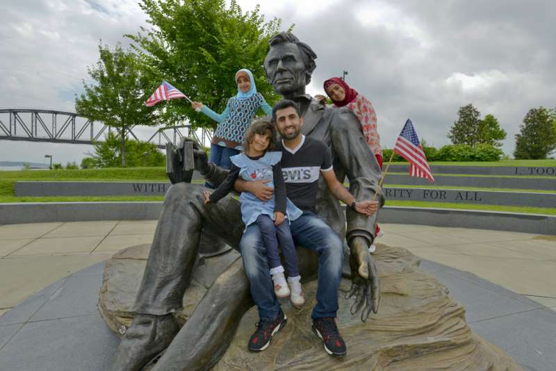 The resettled Sabri family from Iraq. Father Ali and three of his daughters on the Abraham Lincoln statue in Louisville, Kentucky.