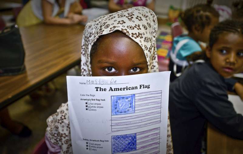 Seven-year-old Mastoura Hasan, a resettled refugee from Sudan now a resident of Louisville in Kentucky, proudly shows her drawing of the Union flag while attending a cultural awareness class. Mastoura fled with her father, mother and three brothers from the Sudan amidst heavy fighting. They arrived in the United States last December.