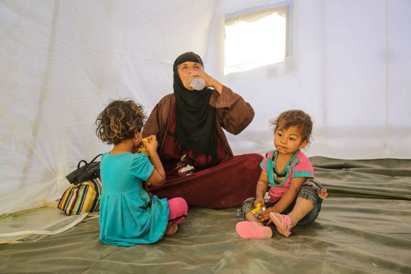 An older woman with two children in a tent at the Khazair checkpoint. They have no money and nowhere to go after fleeing Mosul. The government and UNHCR are providing them with shelter, hygiene kits and other basic supplies.