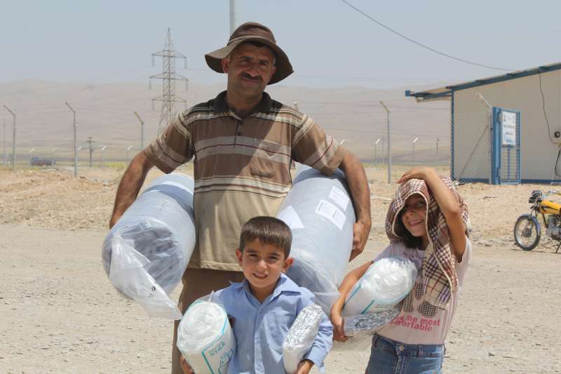 A Syrian father and his sons in northern Iraq carry bedding aid items donated by the IKEA Foundation.
