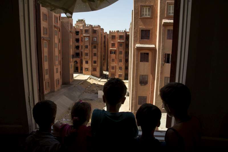 Syrian refugee children look out on a trash strewn common area from their family's apartment window in the lower income Masaken Osman neighborhood on the outskirts of Cairo, Egypt. There are no schools there and no playgrounds.