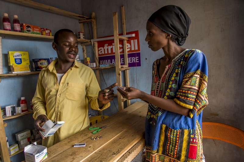 Burundian refugee Larson talks with a customer at his pharmacy in Nakivale refugee settlement in Uganda.