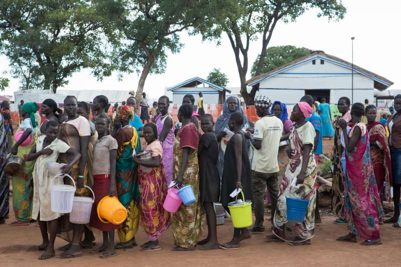 South Sudanese refugees line up for food at a transit centre in Adjumani, Uganda, June 2015.