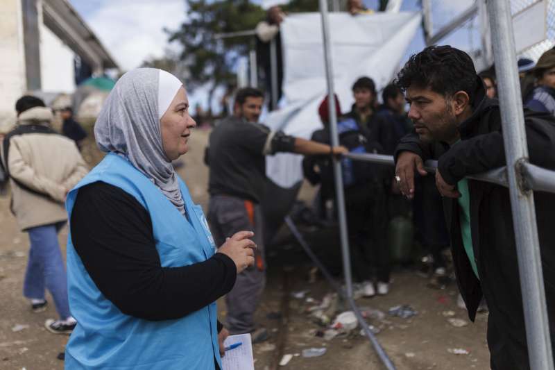 Huda Al-Shabsogh, a UNHCR field officer working with unaccompanied minors on the Greek island of Lesbos, chats to a refugee at the Moria Reception and Registration Centre.