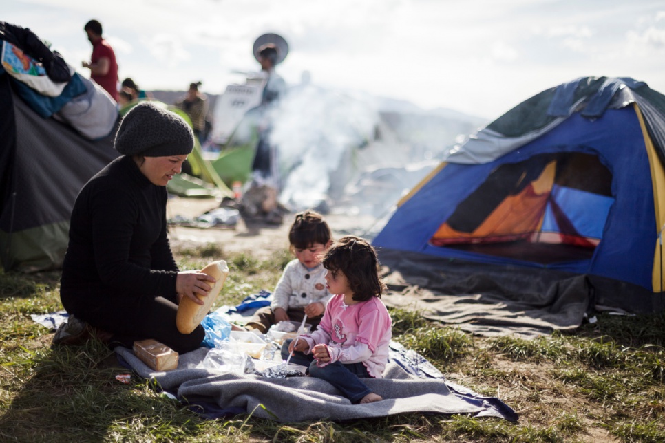A mother feeds her two youngest children outside their tent in a makeshift camp near Idomeni.
