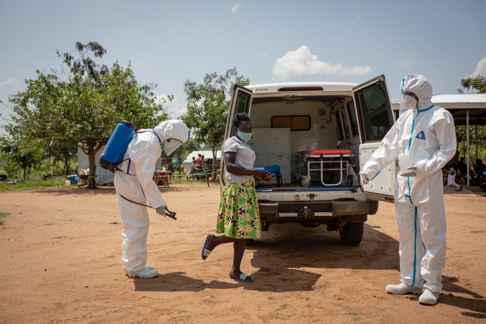 Health workers demonstrate the procedures they follow when responding to a suspected COVID-19 case at Bidibidi refugee settlement, Uganda.