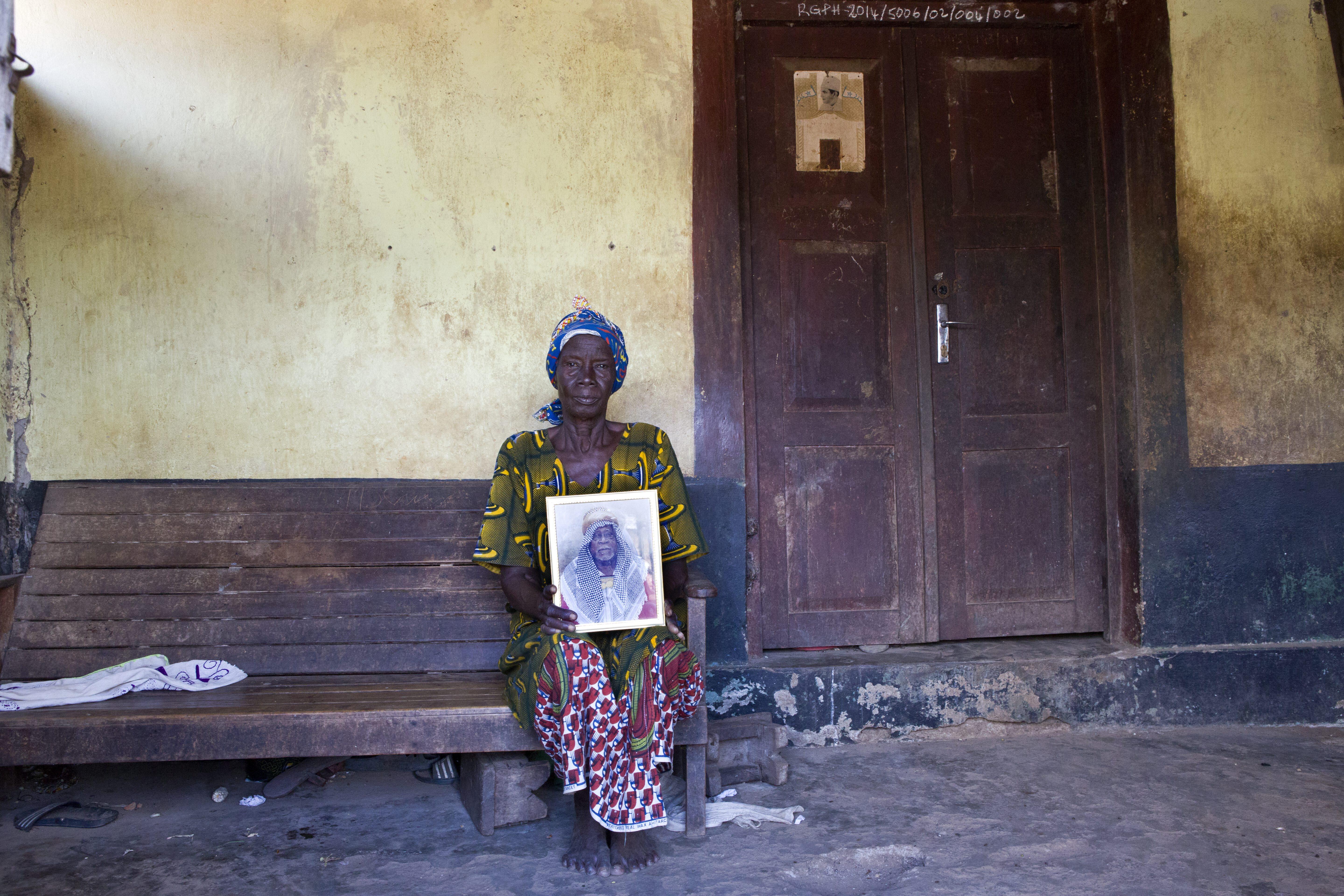 Nana, 79 ans, regarde tendrement le portrait de son mari défunt, El Haj Kabré Boureima, qui est décédé en 2013. Dans les années 40, le couple a quitté le Burkina Faso pour s'installer à Saria, au centre de la Côte d'Ivoire, avec la première vague de travail forcé pour travailler dans les champs de cacao de la région.