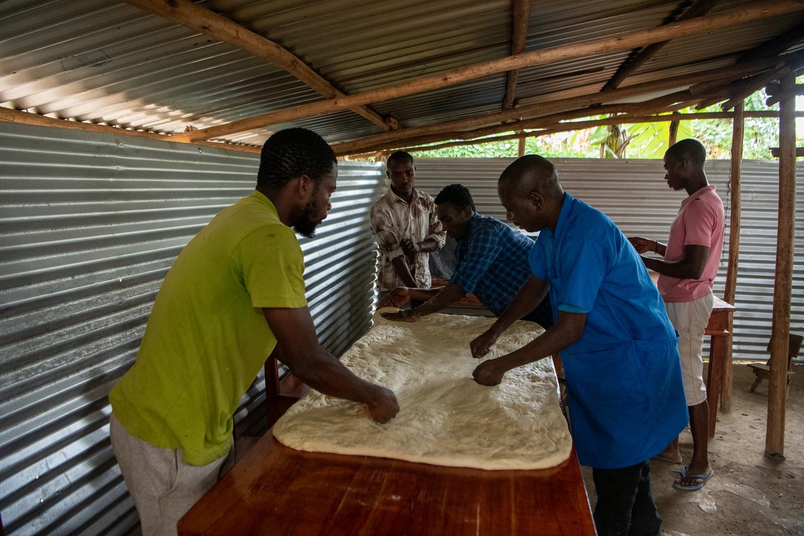 Cadet Kavugwa Shebulike prépare du pain avec ses employés et stagiaires dans sa boulangerie dans le camp de réfugiés de Nyankanda au Burundi.