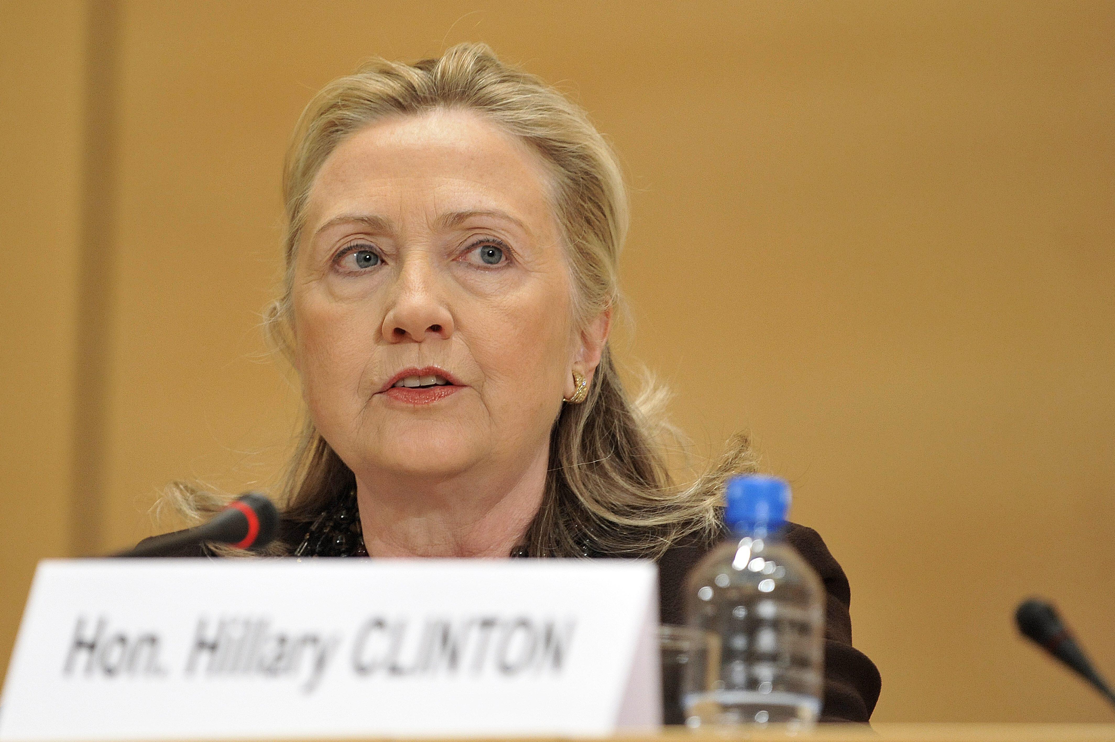 La Secrétaire d'Etat américaine Hillary Clinton durant son allocution, le premier jour de la conférence ministérielle du HCR, au Palais des Nations à Genève en Suisse.