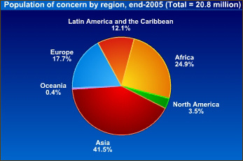 Les 6,6 millions de déplacés internes que l'UNHCR aide déjà représentent 32 pour cent des 20,8 millions de personnes relevant de sa compétence en 2005, arrivant en seconde position après les réfugiés, qui constituent la part majoritaire avec 40 pour cent. Les 28 pour cent restants incluent les personnes rapatriées - réfugiées et déplacées - (1,6 million) ; les demandeurs d'asile (773 000) ; les apatrides (2,4 millions) et enfin diverses populations comprenant notamment les personnes qui ne peuvent déposer une demande d'asile bien qu'elles aient besoin de protection (960 000). Les 4,3 millions de réfugiés palestiniens relèvent de la responsabilité de l'UNRWA (Office de secours et de travaux des Nations Unies pour les réfugiés de Palestine dans le Proche-Orient).