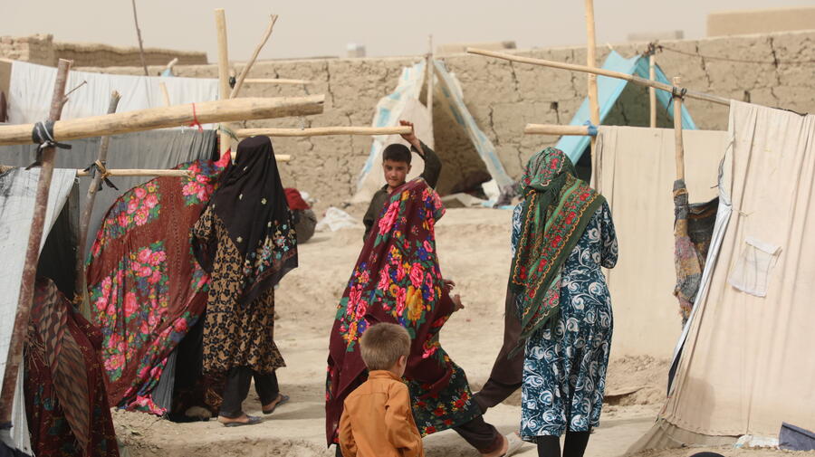 Des femmes évoluent parmi les tentes de fortune d'un camp de personnes déplacées internes dans la ville de Mazar-e Sharif, dans le nord de l'Afghanistan.
