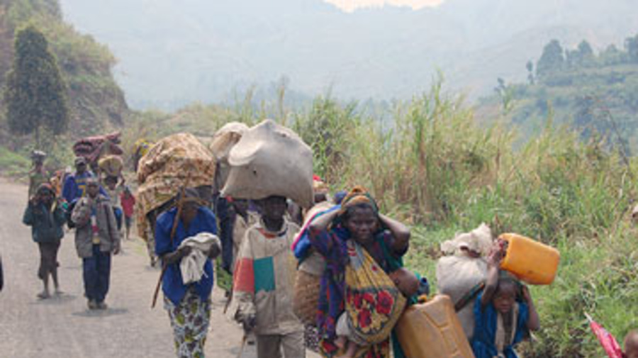 Des déplacés fuient pour échapper aux combats survenant entre l'armée congolaise et des troupes rebelles dans la province du Nord-Kivu.