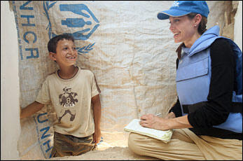 Lors de sa première visite en Iraq et en Syrie, l'ambassadrice de bonne volonté de l'UNHCR Angelina Jolie a exprimé sa sympathie à l'égard des réfugiés iraquiens. Elle a passé des heures à écouter le récit d'expériences atroces vécues par un survivant de la torture, par une victime de coups de feu et par d'autres.