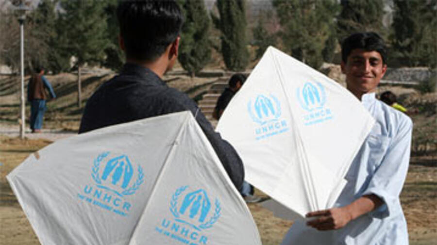 Des enfants afghans et pakistanais préparent l'envol de leurs cerfs-volants aux couleurs de l'UNHCR.