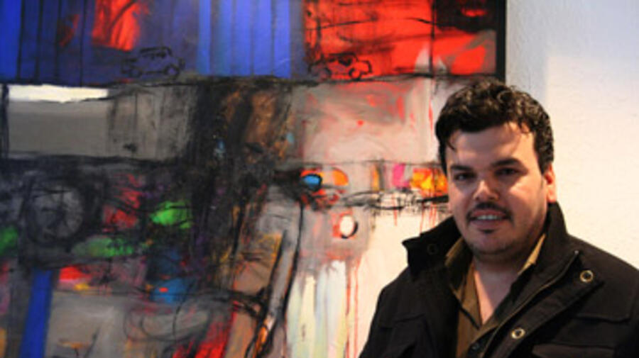 Wadhah Mahdi près de l'une des oeuvres colorées.