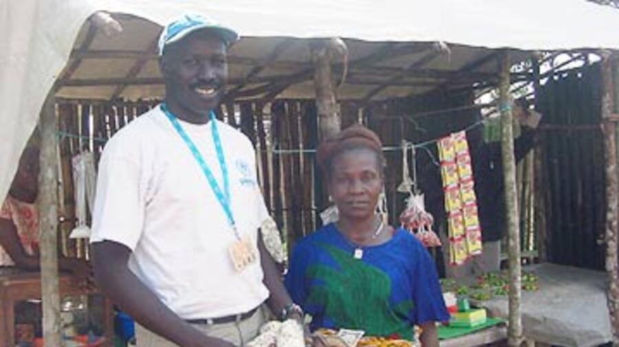Henok Ochalla de l'UNHCR avec Fatmata Vannie, une rapatriée, devant son petit étal à Tahn, dans le comté de Grand Cape Mount, Libéria.