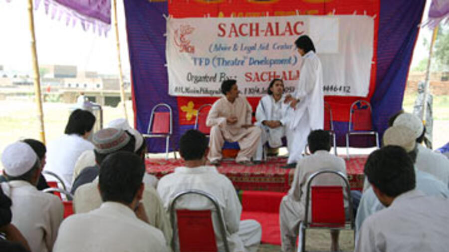 Cette scène pourrait se produire partout au Pakistan, et tout spécialement dans le cadre des conditions de sécurité actuellement renforcées. Elle fait aussi partie d'un projet nommé « Théâtre pour le développement » mis en place par Struggle for Change (SACH), une organisation pakistanaise non gouvernementale qui travaille avec le HCR pour sensibiliser les Afghans sur leurs droits et leurs devoirs en tant que réfugiés.