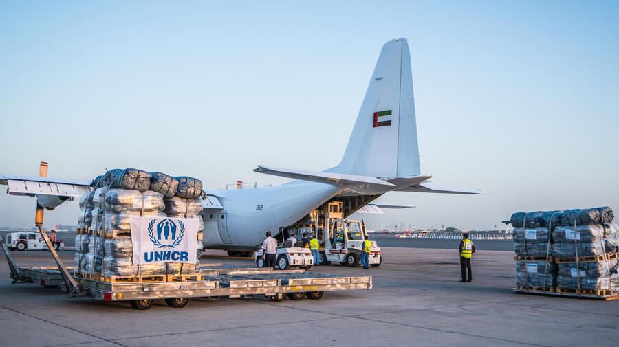 Chargement de 60 000 couvertures depuis le l'entrepôt de stockage du HCR à Dubaï pour une distribution en Grèce. L'affrètement est offert par le gouvernement des Émirats arabes unis par l'intermédiaire d'International Humanitarian City.