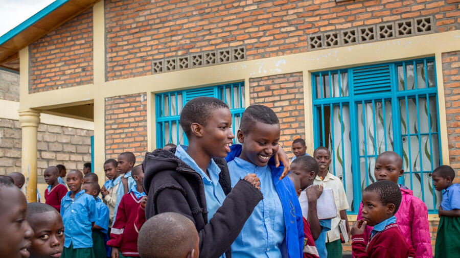 Après l'assemblée du matin au Collège Paysannat L, en bordure du camp de réfugiés de Mahama, dans l'est du Rwanda, les élèves se dépêchent de rejoindre leurs salles de classe respectives. Parmi eux, Bellaca et Anethe rient et se tiennent par la main, de toute évidence les meilleures amies du monde.
