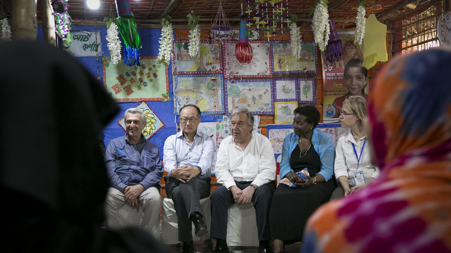 Le Secrétaire général des Nations Unies, António Guterres, a lancé cet appel lors d'une visite du plus vaste camp de réfugiés du monde situé dans le sud-est du Bangladesh, à proximité de la frontière avec le Myanmar. Le Président du Groupe de la Banque mondiale, Jim Yong Kim, l'accompagnait pour l'occasion sous les pluies battantes de la mousson.