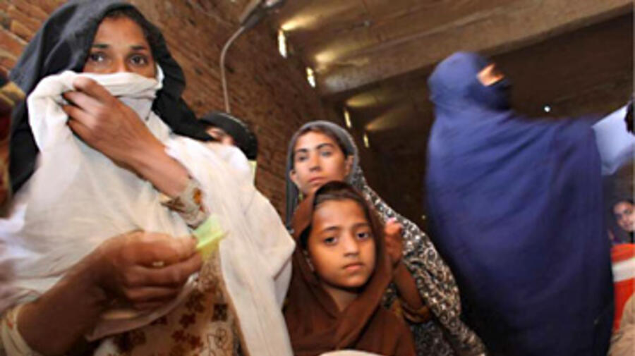 Des femmes et des jeunes filles déplacées internes pakistanaises font la queue pour recevoir des articles de secours du HCR. La coopération avec les Emirats arabes unis vise à financer l'opération du HCR au Pakistan.
