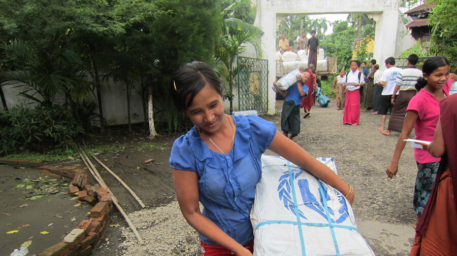 Dans le cadre de la réponse interagence dans l'Etat de Rakhine, le HCR a distribué des articles d'aide à quelque 54 000 personnes dans les sites de déplacés. Parmi ces articles, on compte des bâches en plastique, des matelas, des couvertures, des moustiquaires et des ustensiles de cuisine. Nous apportons également un appui dans la construction d'abris temporaires qui peuvent héberger environ 10 500 personnes. Parallèlement, la communauté humanitaire apporte son aide par la distribution d'articles essentiels dans les camps de déplacés qui sont gérés par les autorités, en s'assurant que les déplacés reçoivent de la nourriture, de l'eau potable, des soins de santé et que des installations sanitaires ont été montées - et ce jusqu'à ce que la situation soit suffisamment stabilisée pour un retour des déplacés dans leurs villages d'origine.
