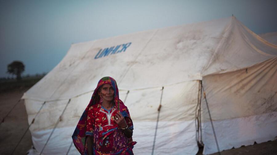 Membre de la communauté hindoue, minoritaire au Pakistan, Imya vit désormais dans une tente du HCR au milieu d'un camp de secours dans le district de Sanghar, province de Sindh. « Le jour de l'inondation, c'était l'apocalypse », s'est-elle rappelée. « J'ai vu l'eau monter jusqu'au niveau de la poitrine. Tout le monde fuyait. »