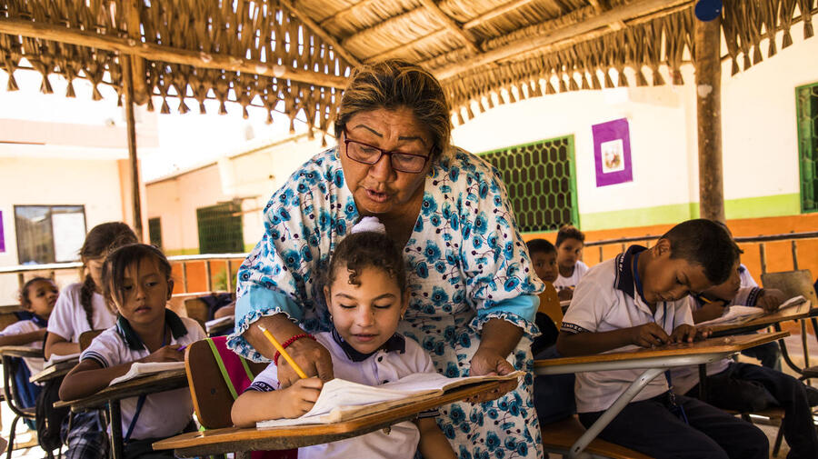 Une enseignante aide une élève d'une classe d'enfants réfugiés colombiens et vénézuéliens à Paraguachón, en Colombie.