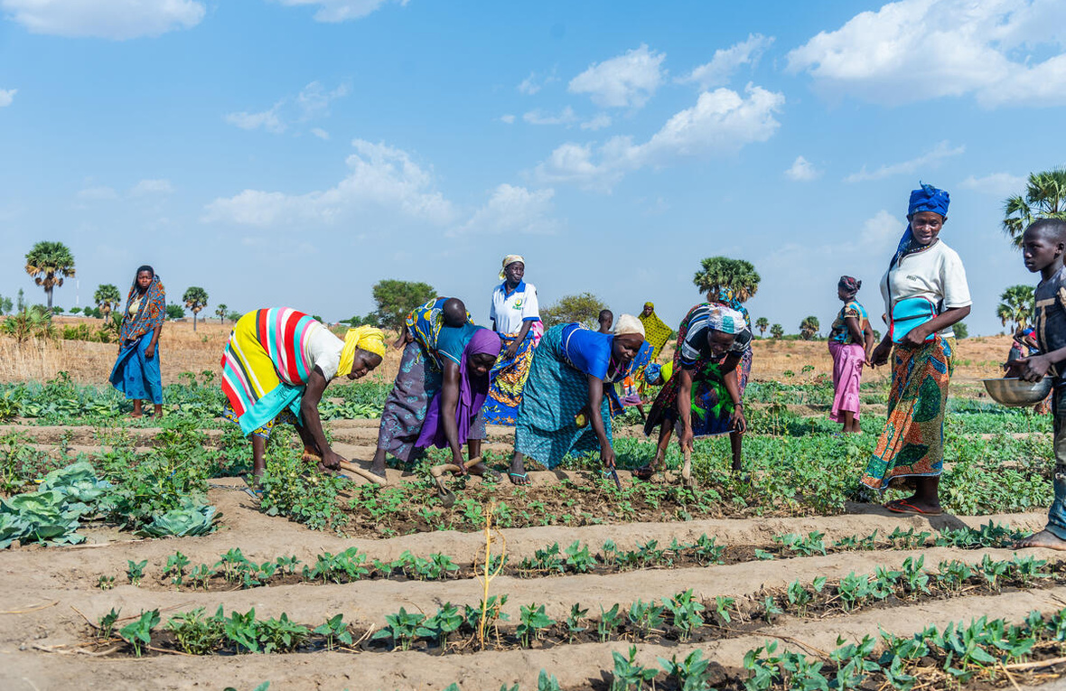 Des femmes réfugiées et celles de la communauté hôte labourent leur jardin à Biankouri, au Togo.