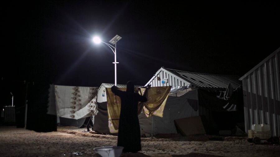 Une syrienne étend son linge à la lumière d'un réverbère solaire dans le camp de réfugiés d'Azraq en Jordanie.