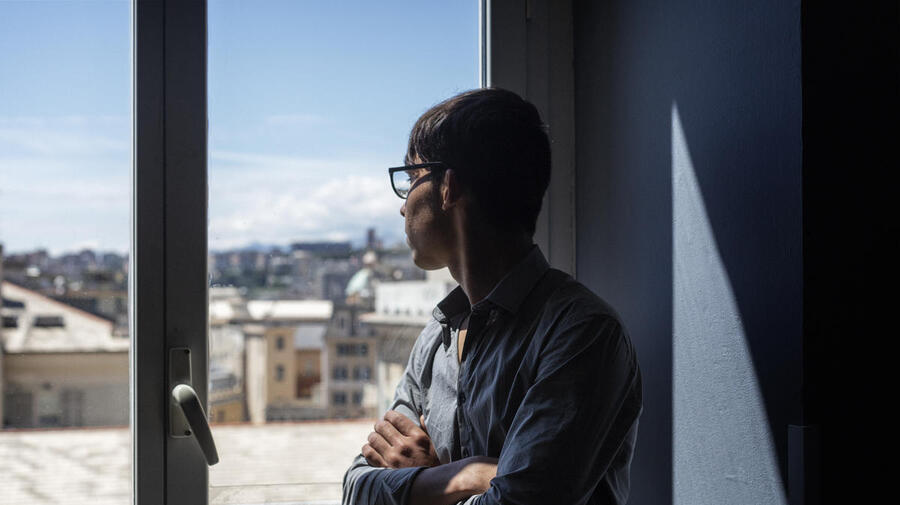 Farouk* contemple Gênes, en Italie, depuis un centre d'accueil où il a été hébergé avant de s'installer à Londres dans le cadre d'un programme de regroupement familial.