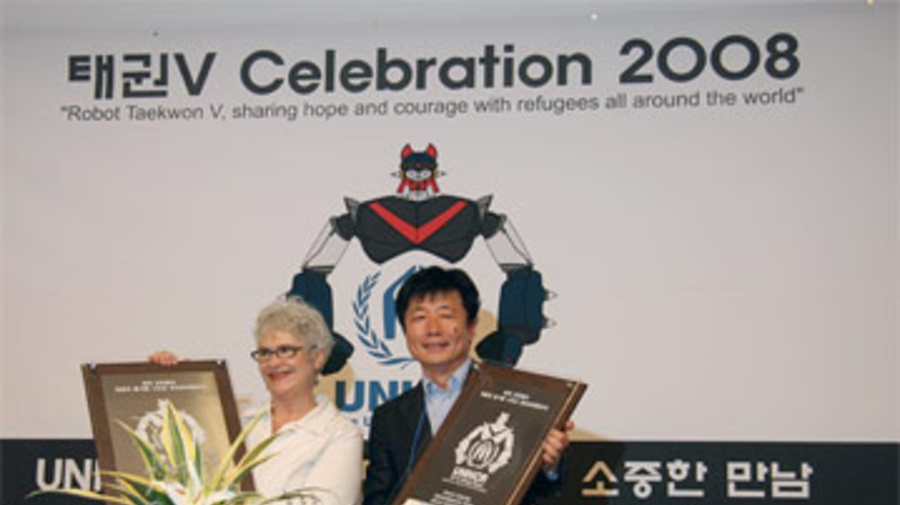 Robot Taekwon V, le héros de dessin animé d'arts martiaux, a été nommé envoyé de bonne volonté de l'UNHCR en Corée du Sud, pour aider à collecter des fonds et à faire connaître la question des réfugiés.